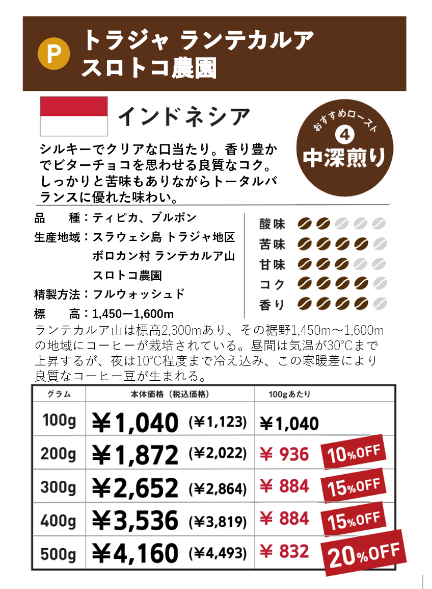 インドネシア トラジャ ランテカルア スロトコ農園 300g(100g単価の15%OFF)