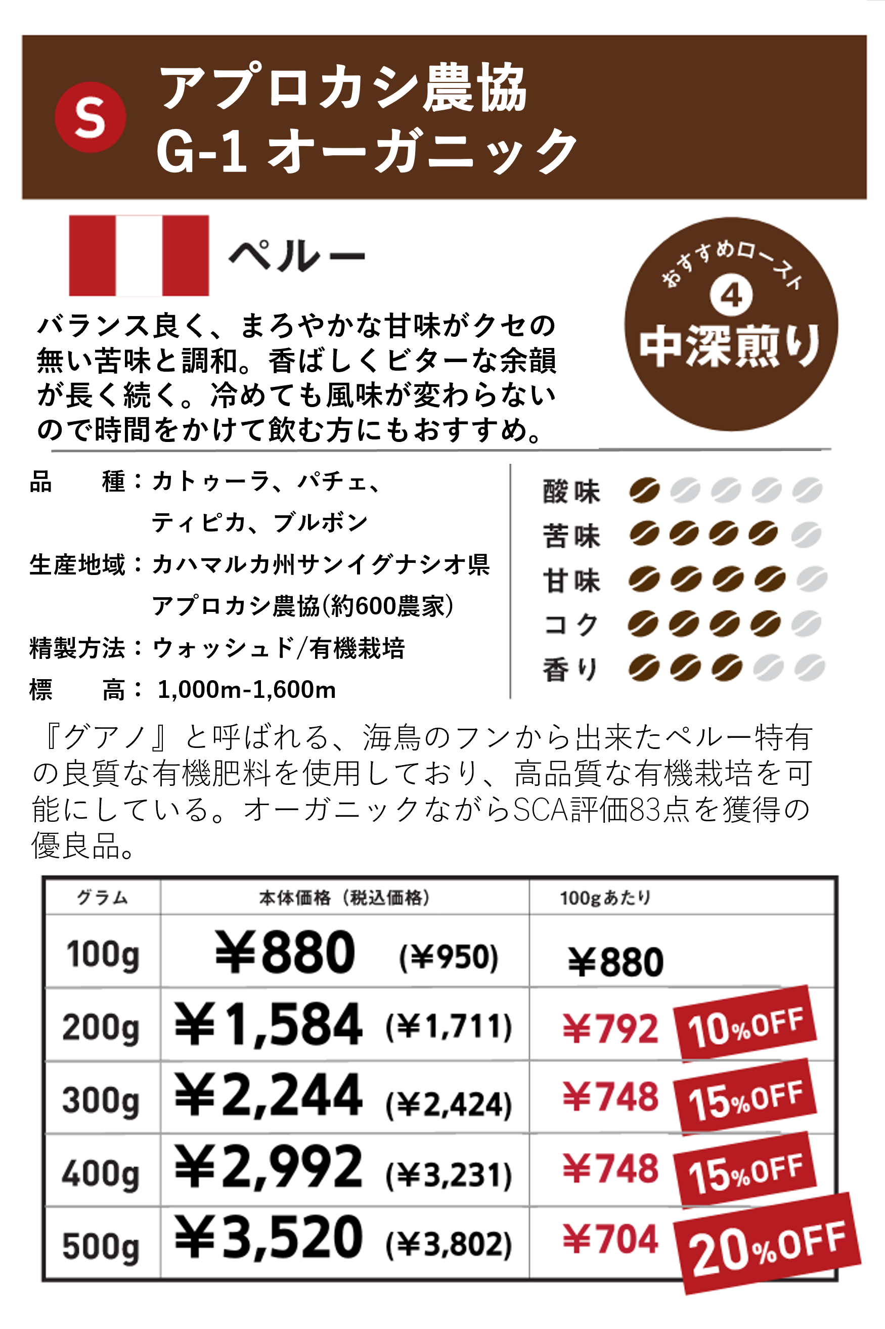 ペルー アプロカシ農協 G-1 オーガニック 500g(100g単価の20%OFF)