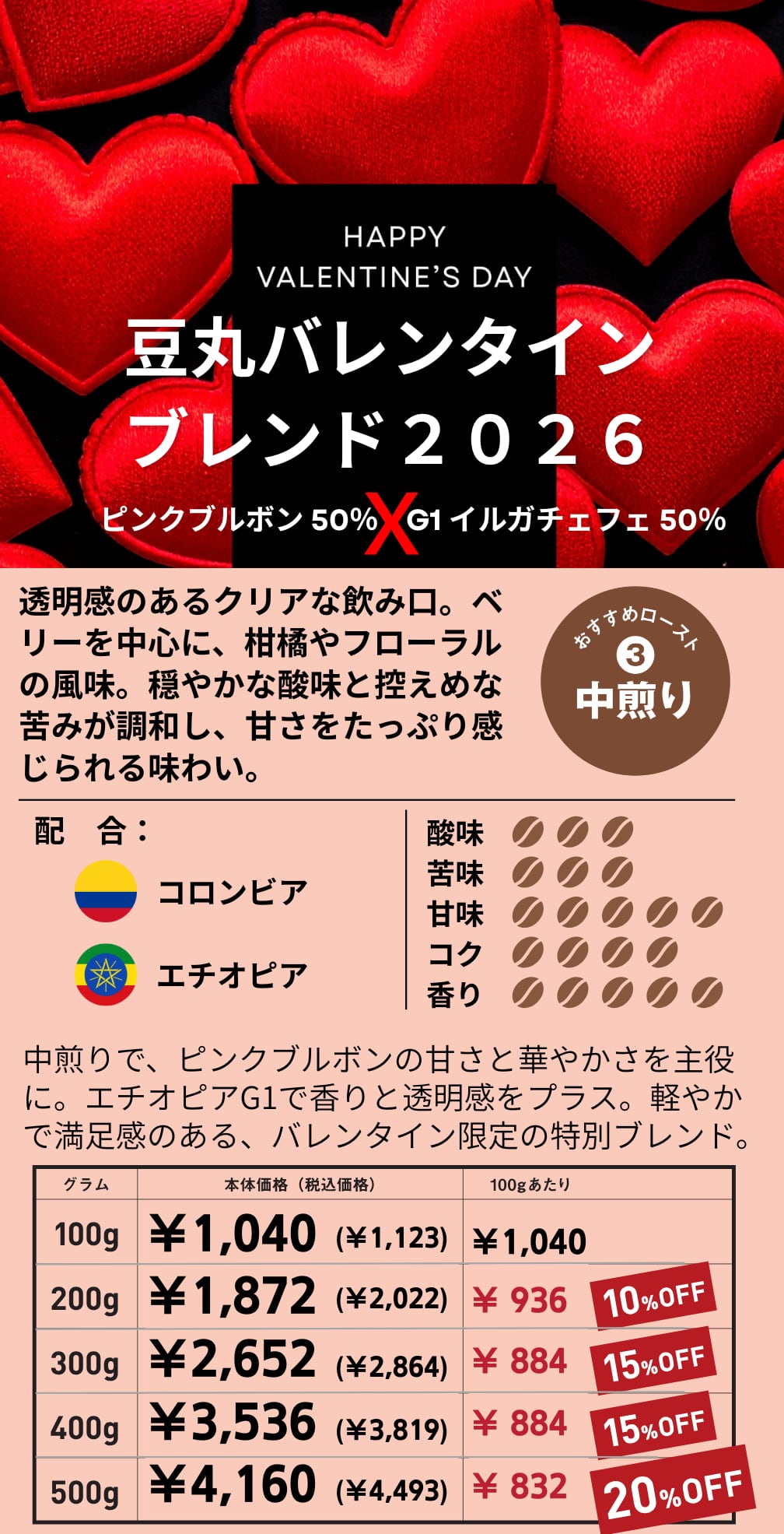 【期間限定】豆丸バレンタイン ブレンド2026 / 500g(100g単価の20%OFF)